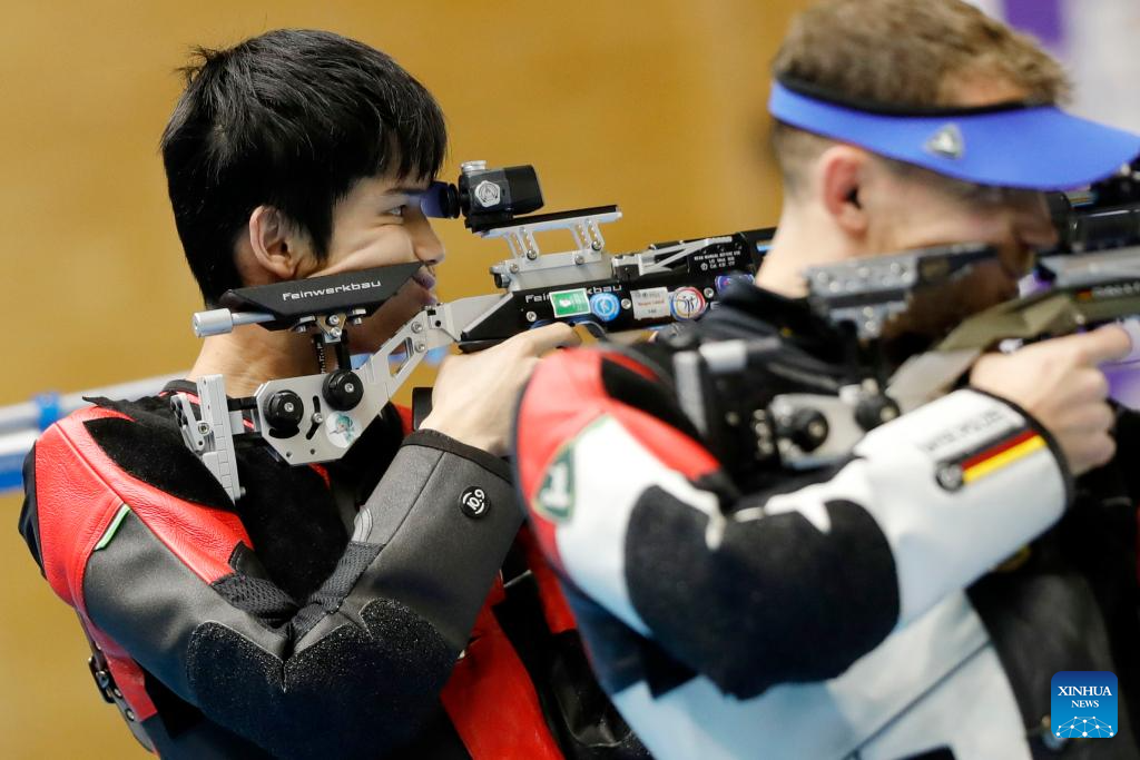 Sheng Lihao (L) of China competes during the 10m air rifle men's final of shooting at the 2025 ISSF World Championship Rifle/Pistol in Cairo, Egypt, on Nov. 8, 2025. (Xinhua/Ahmed Gomaa)