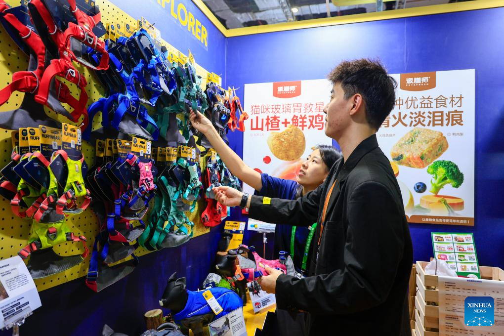 A customer (R) selects products at a pet supplies store at the Consumer Goods Exhibition area during the eighth China International Import Expo (CIIE) in east China's Shanghai, Nov. 8, 2025. At the Consumer Goods Exhibition area of the eighth CIIE, apparel, daily chemicals, home furnishings, and cultural and sports products were prominently showcased, reflecting global consumption trends and improvements in quality of life. (Xinhua/Liu Jiaqi)