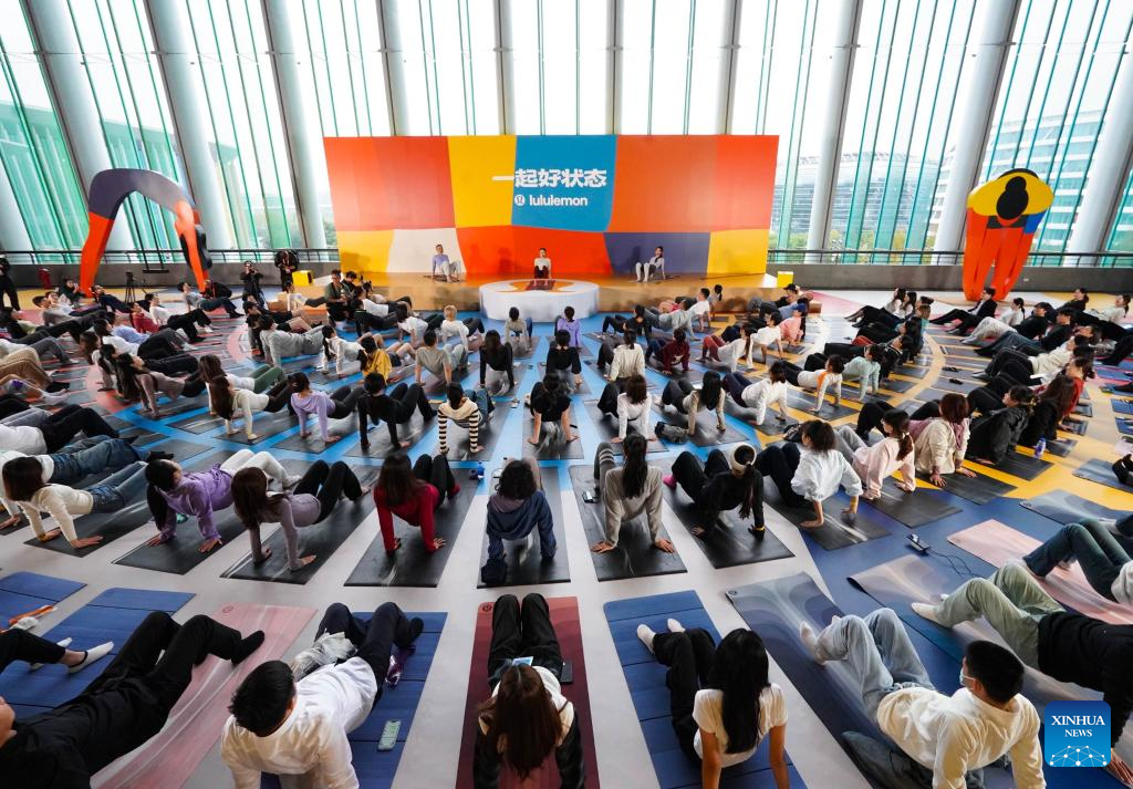 This photo shows a yoga event for one hundred participants organized by Lululemon outside the Consumer Goods Exhibition area during the eighth China International Import Expo (CIIE) in east China's Shanghai, Nov. 8, 2025. At the Consumer Goods Exhibition area of the eighth CIIE, apparel, daily chemicals, home furnishings, and cultural and sports products were prominently showcased, reflecting global consumption trends and improvements in quality of life. (Xinhua/Du Xinyi)