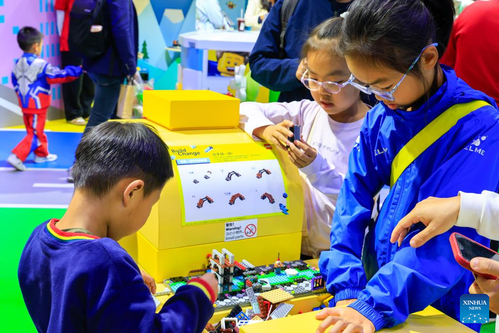 Kids play LEGO blocks at the Consumer Goods Exhibition area during the eighth China International Import Expo (CIIE) in east China's Shanghai, Nov. 8, 2025. At the Consumer Goods Exhibition area of the eighth CIIE, apparel, daily chemicals, home furnishings, and cultural and sports products were prominently showcased, reflecting global consumption trends and improvements in quality of life. (Xinhua/Liu Jiaqi)