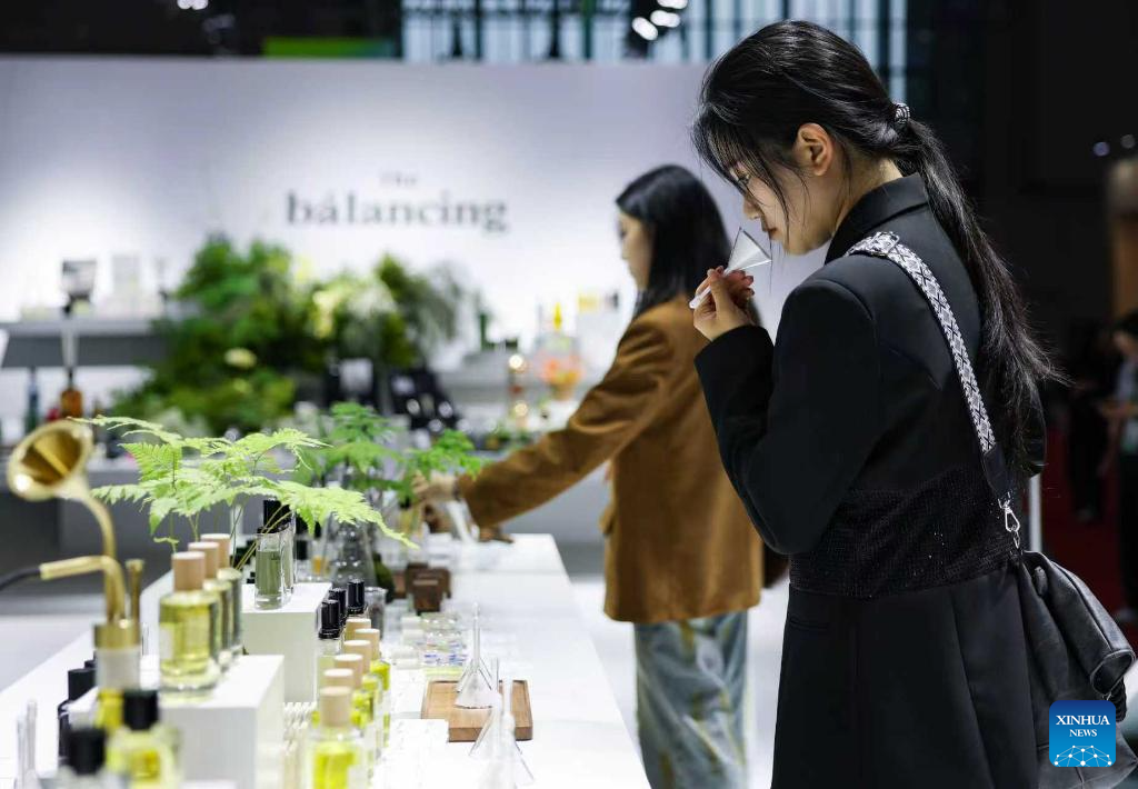 Visitors sample fragrances at a perfume brand booth at the Consumer Goods Exhibition area during the eighth China International Import Expo (CIIE) in east China's Shanghai, Nov. 8, 2025. At the Consumer Goods Exhibition area of the eighth CIIE, apparel, daily chemicals, home furnishings, and cultural and sports products were prominently showcased, reflecting global consumption trends and improvements in quality of life. (Xinhua/Wang Zecong)