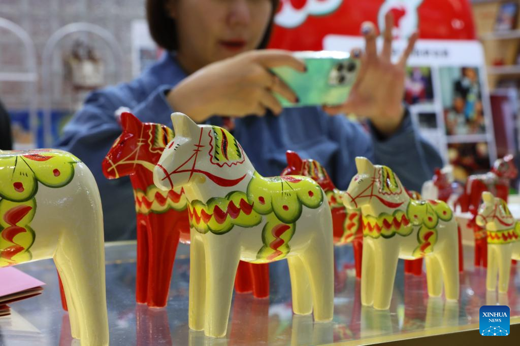 A visitor takes photos of traditional Swedish handicrafts at the Consumer Goods Exhibition area during the eighth China International Import Expo (CIIE) in east China's Shanghai, Nov. 7, 2025. At the Consumer Goods Exhibition area of the eighth CIIE, apparel, daily chemicals, home furnishings, and cultural and sports products were prominently showcased, reflecting global consumption trends and improvements in quality of life. (Xinhua/Fang Zhe)