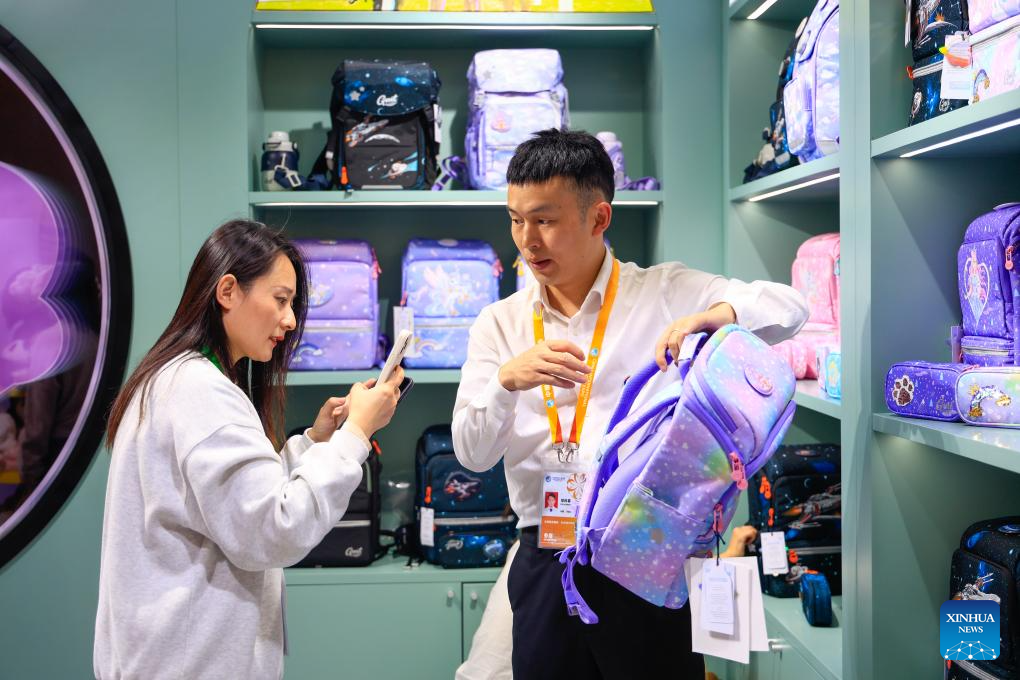 A visitor (L) learns about products at a children's backpack brand booth at the Consumer Goods Exhibition area during the eighth China International Import Expo (CIIE) in east China's Shanghai, Nov. 8, 2025. At the Consumer Goods Exhibition area of the eighth CIIE, apparel, daily chemicals, home furnishings, and cultural and sports products were prominently showcased, reflecting global consumption trends and improvements in quality of life. (Xinhua/Liu Jiaqi)