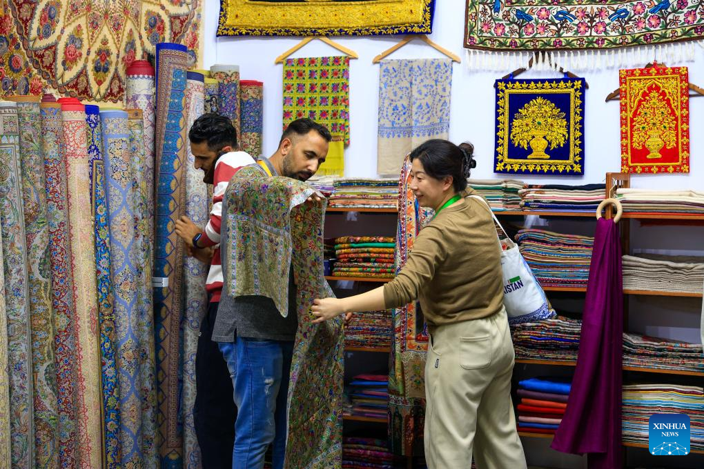 A visitor (R) learns about products at a carpet booth of Pakistan at the Consumer Goods Exhibition area during the eighth China International Import Expo (CIIE) in east China's Shanghai, Nov. 8, 2025. At the Consumer Goods Exhibition area of the eighth CIIE, apparel, daily chemicals, home furnishings, and cultural and sports products were prominently showcased, reflecting global consumption trends and improvements in quality of life. (Xinhua/Liu Jiaqi)