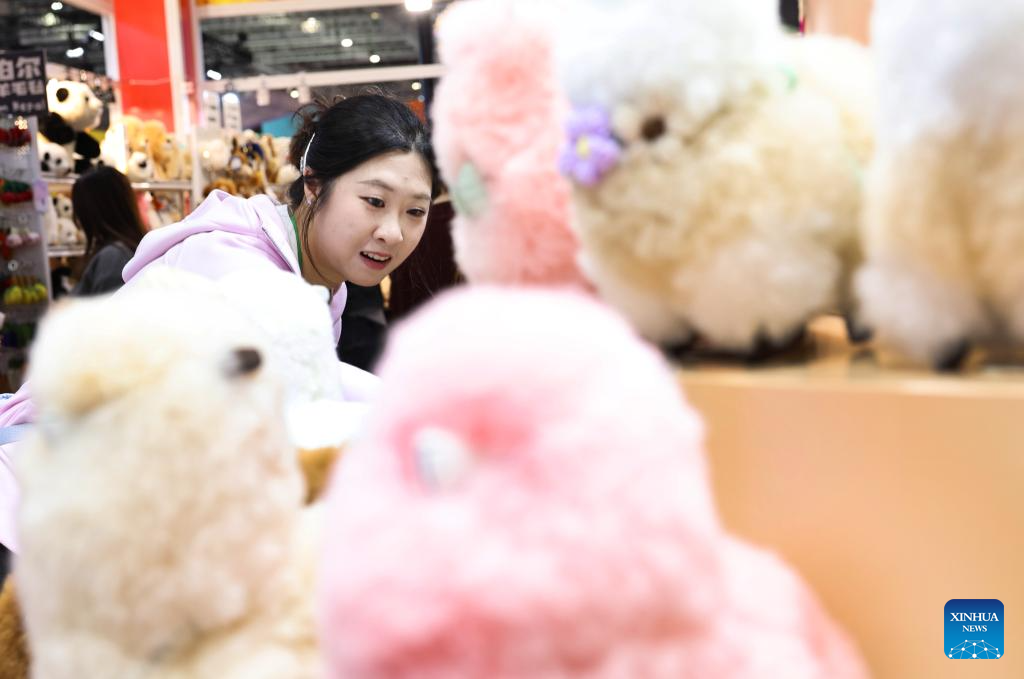 A visitor views alpaca wool products of Peru at the Consumer Goods Exhibition area during the eighth China International Import Expo (CIIE) in east China's Shanghai, Nov. 8, 2025. At the Consumer Goods Exhibition area of the eighth CIIE, apparel, daily chemicals, home furnishings, and cultural and sports products were prominently showcased, reflecting global consumption trends and improvements in quality of life. (Xinhua/Fang Zhe)