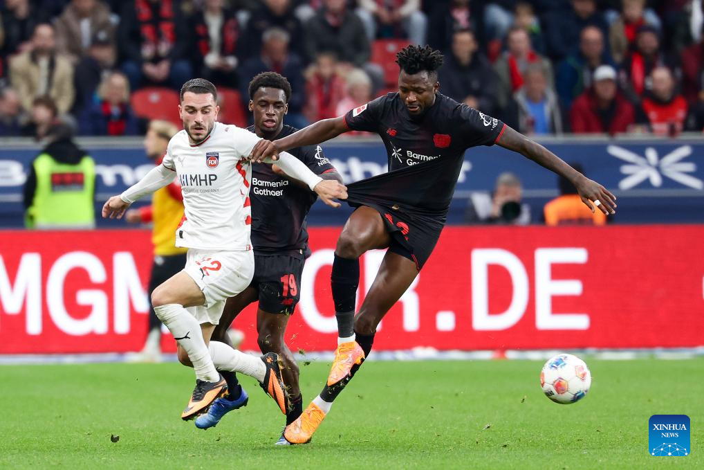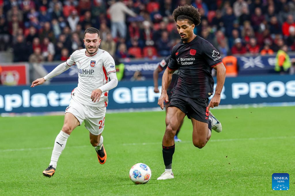 Ibrahim Maza of Bayer 04 Leverkusen celebrates a goal during the German first division of Bundesliga football match between Bayer 04 Leverkusen and 1. FC Heidenheim 1846 in Leverkusen, Germany, Nov. 8. 2025. (Photo by Joachim Bywaletz/Xinhua)