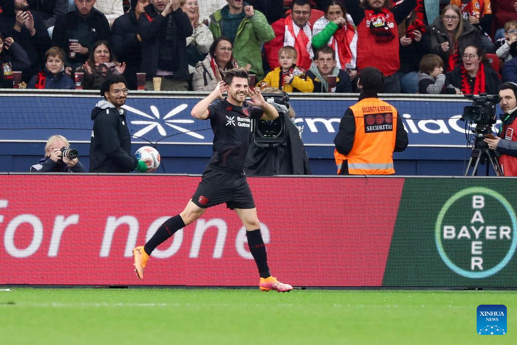 Jonas Hofmann of Bayer 04 Leverkusen celebrates a goal during the German first division of Bundesliga football match between Bayer 04 Leverkusen and 1. FC Heidenheim 1846 in Leverkusen, Germany, Nov. 8. 2025. (Photo by Joachim Bywaletz/Xinhua)