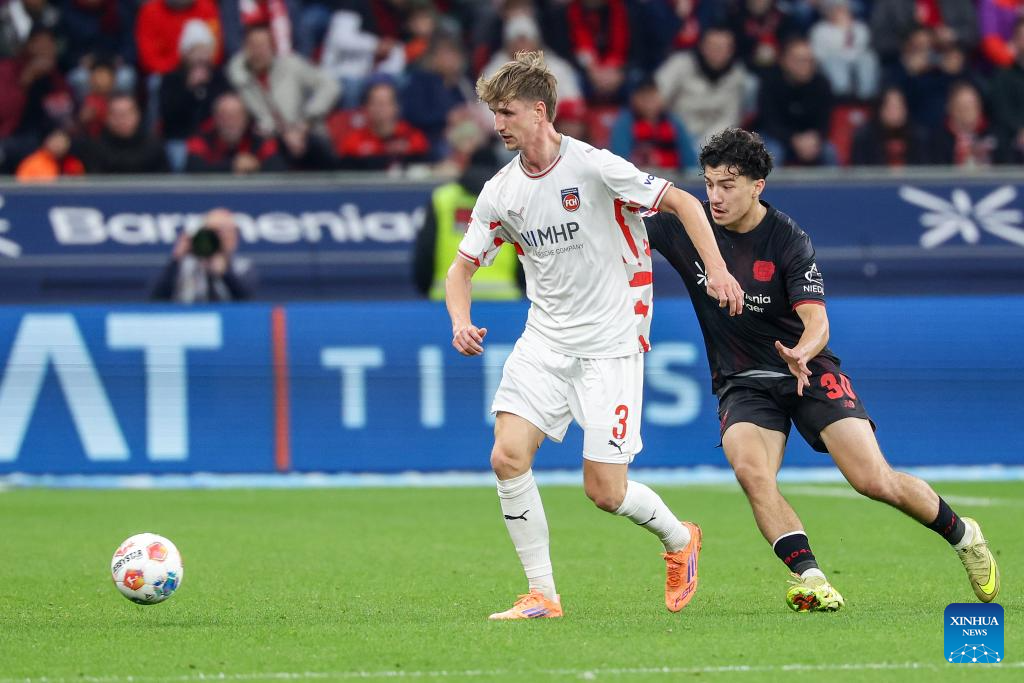 Ernest Poku (L) of Bayer 04 Leverkusen vies with Marnon Busch of 1. FC Heidenheim 1846 during the German first division of Bundesliga football match between Bayer 04 Leverkusen and 1. FC Heidenheim 1846 in Leverkusen, Germany, Nov. 8. 2025. (Photo by Joachim Bywaletz/Xinhua)