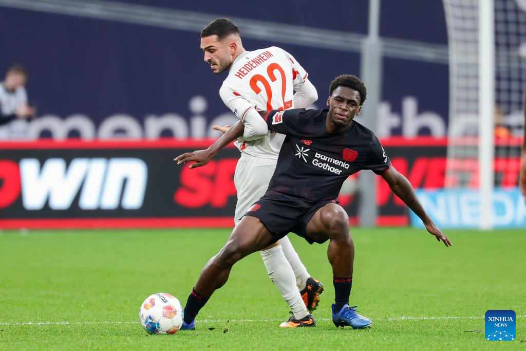 Ibrahim Maza (R) of Bayer 04 Leverkusen vies with Jan Schoeppner of 1. FC Heidenheim 1846 during the German first division of Bundesliga football match between Bayer 04 Leverkusen and 1. FC Heidenheim 1846 in Leverkusen, Germany, Nov. 8. 2025. (Photo by Joachim Bywaletz/Xinhua)