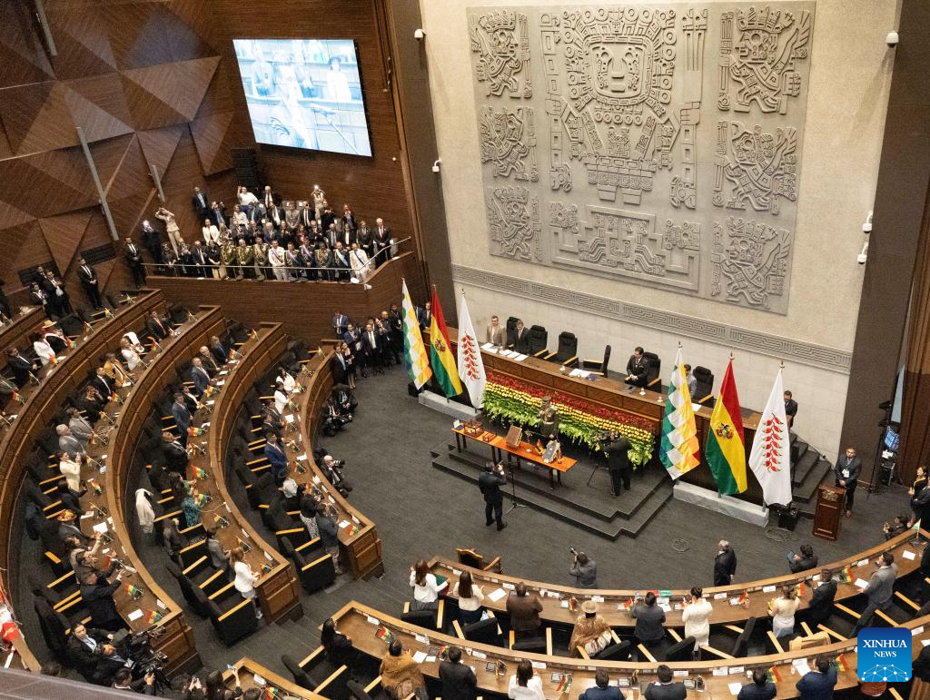 Rodrigo Paz was sworn in as the constitutional president of the Plurinational State of Bolivia for the 2025-2030 term, in the Plurinational Legislative Assembly building in downtown La Paz on Saturday. (Xinhua/Li Mengxin)
