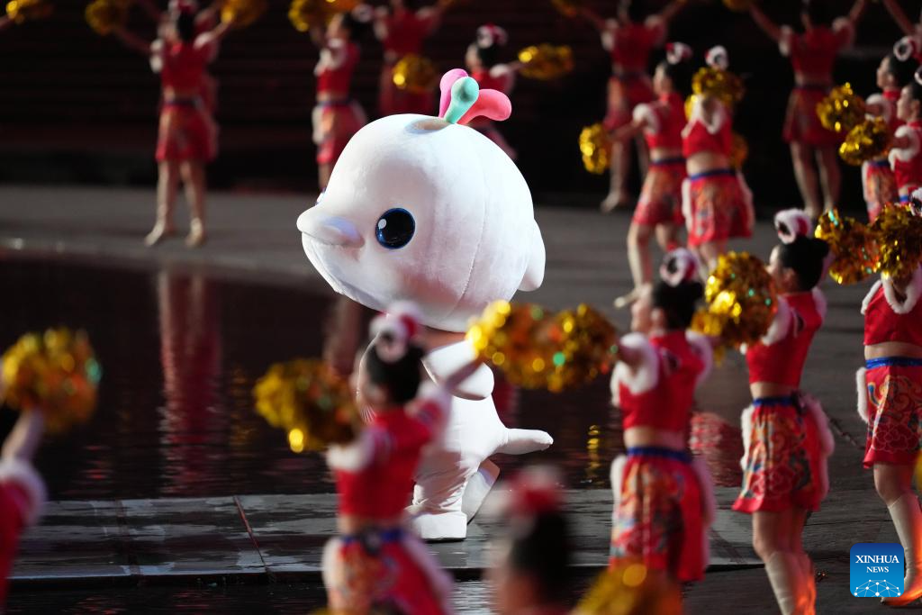 The mascot is seen during the opening ceremony of China's 15th National Games in Guangzhou, south China's Guangdong Province, Nov. 9, 2025. (Xinhua/Li Yibo)