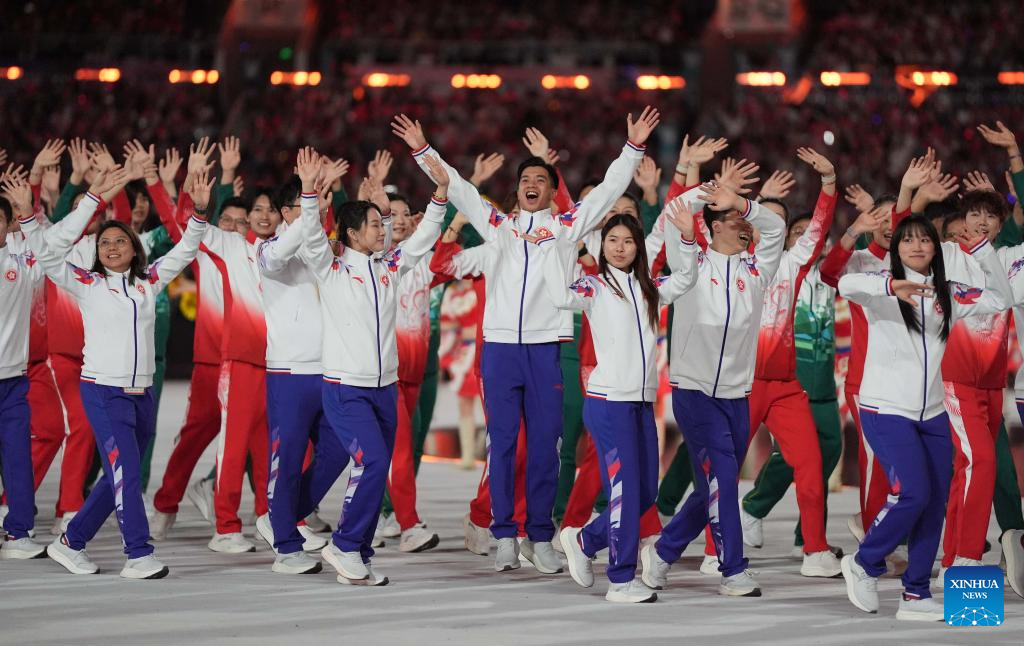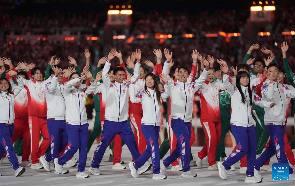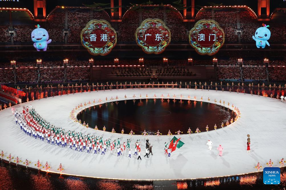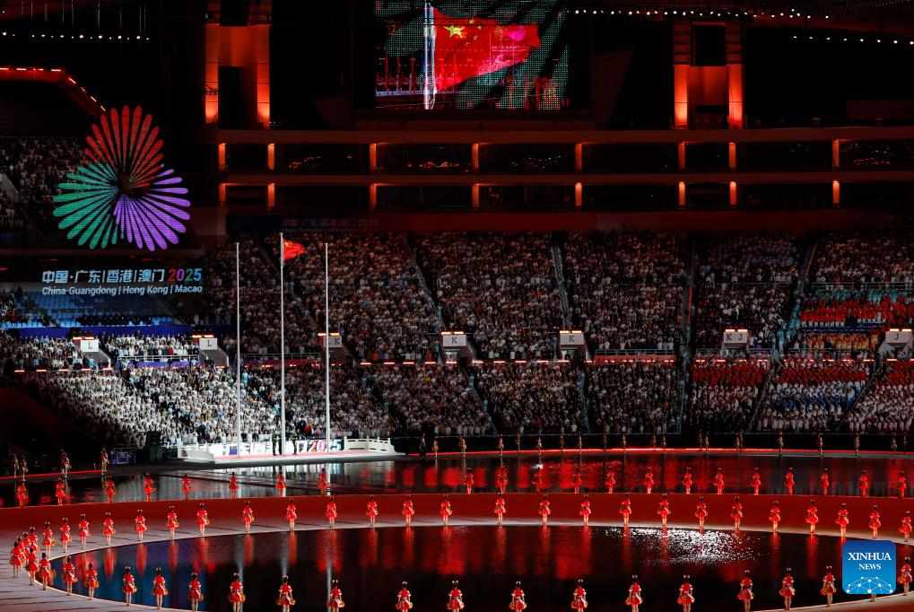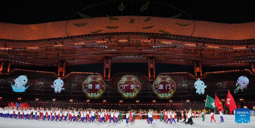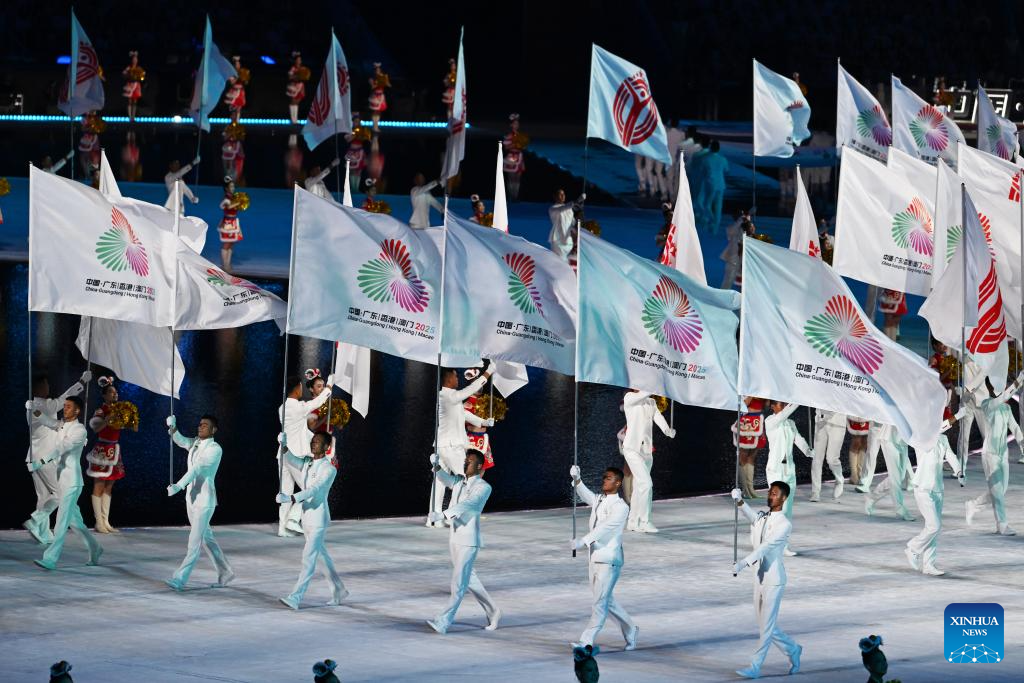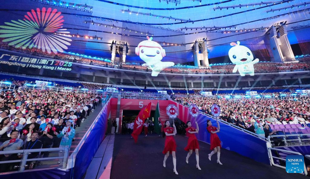 Members of Guangdong, Hong Kong and Macao delegations parade during the opening ceremony of China's 15th National Games in Guangzhou, south China's Guangdong Province, Nov. 9, 2025. (Xinhua/Hu Huhu)