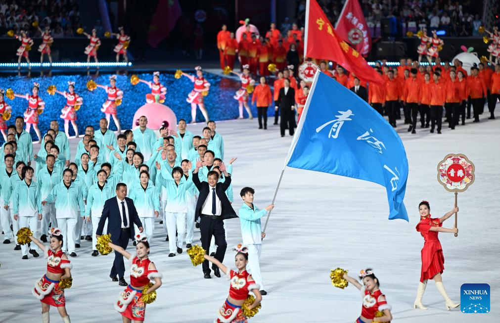 Members of Qinghai delegation parade during the opening ceremony of China's 15th National Games in Guangzhou, south China's Guangdong Province, Nov. 9, 2025. (Xinhua/Deng Hua)