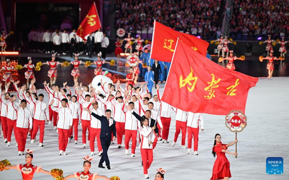 Members of Inner Mongolia delegation parade during the opening ceremony of China's 15th National Games in Guangzhou, south China's Guangdong Province, Nov. 9, 2025. (Xinhua/Deng Hua)