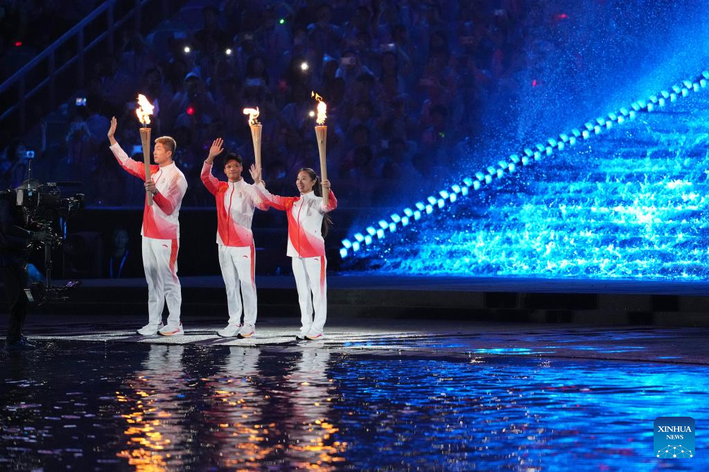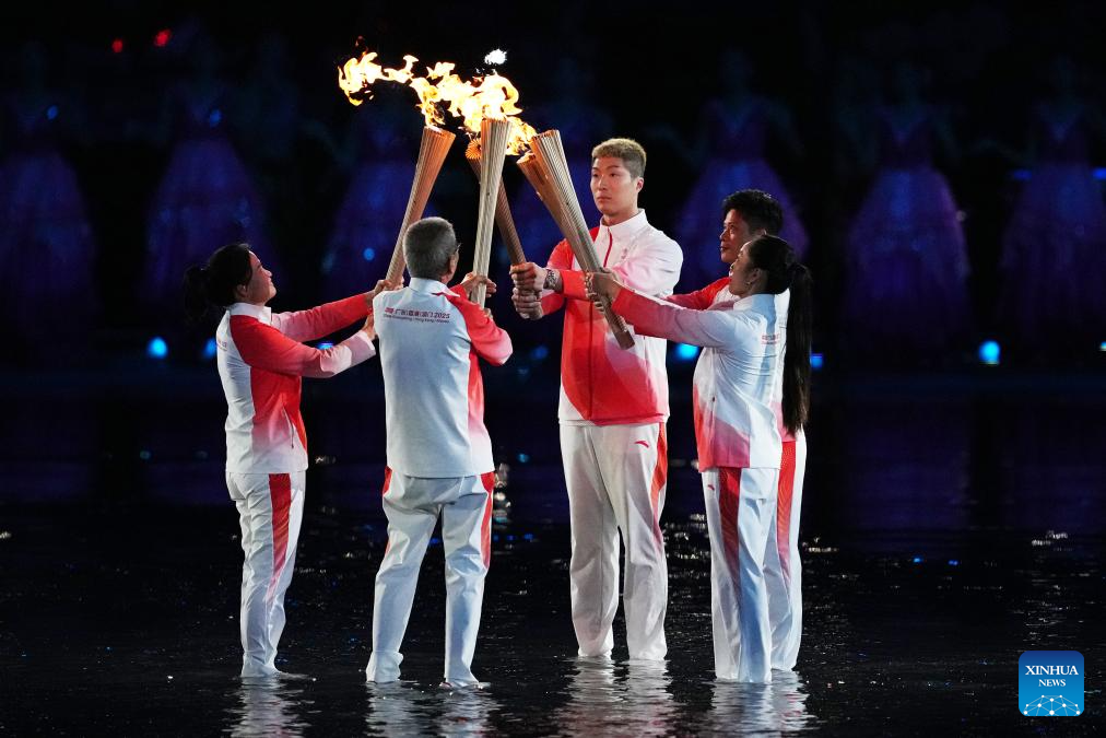 The cauldron is lit during the opening ceremony of China's 15th National Games in Guangzhou, south China's Guangdong Province, Nov. 9, 2025. (Xinhua/Pan Yulong)