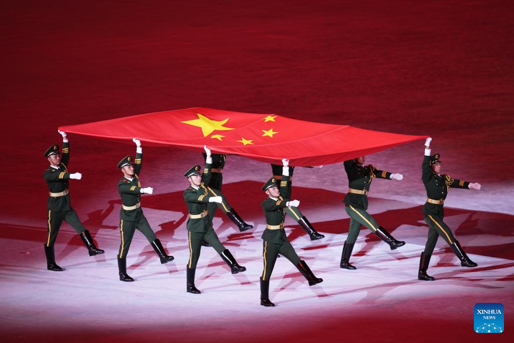 The Chinese national flag is carried during the opening ceremony of the games in Guangzhou, south China's Guangdong Province, Nov. 9, 2025. (Xinhua/Hu Huhu)