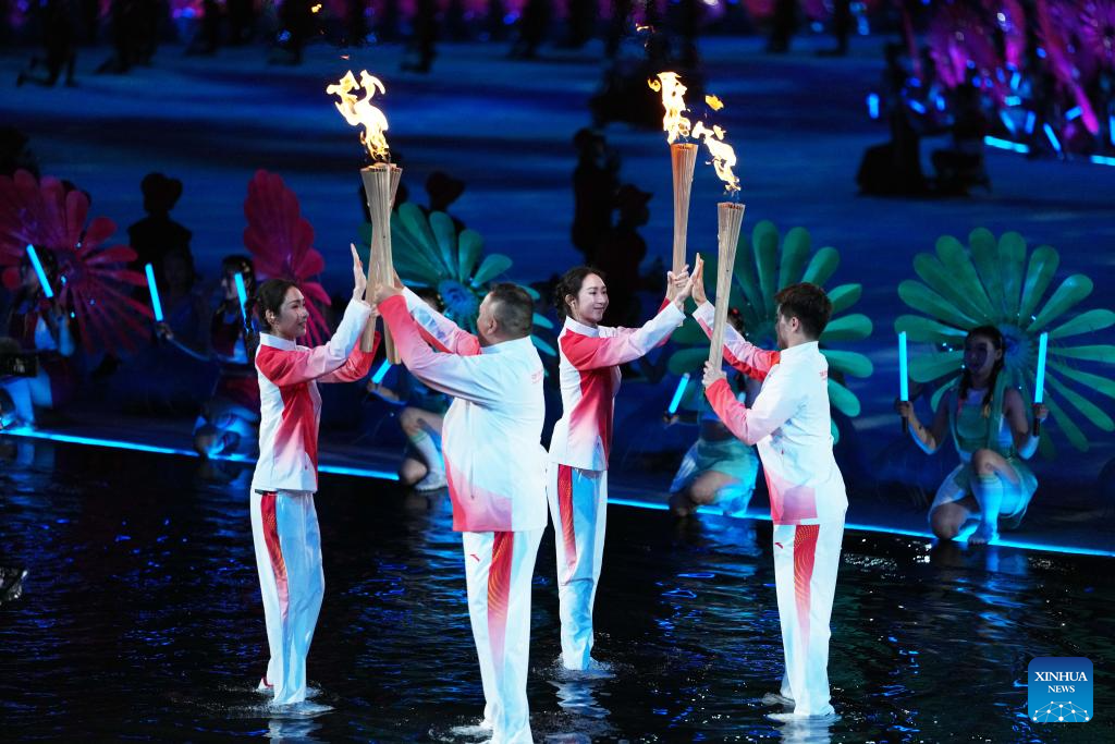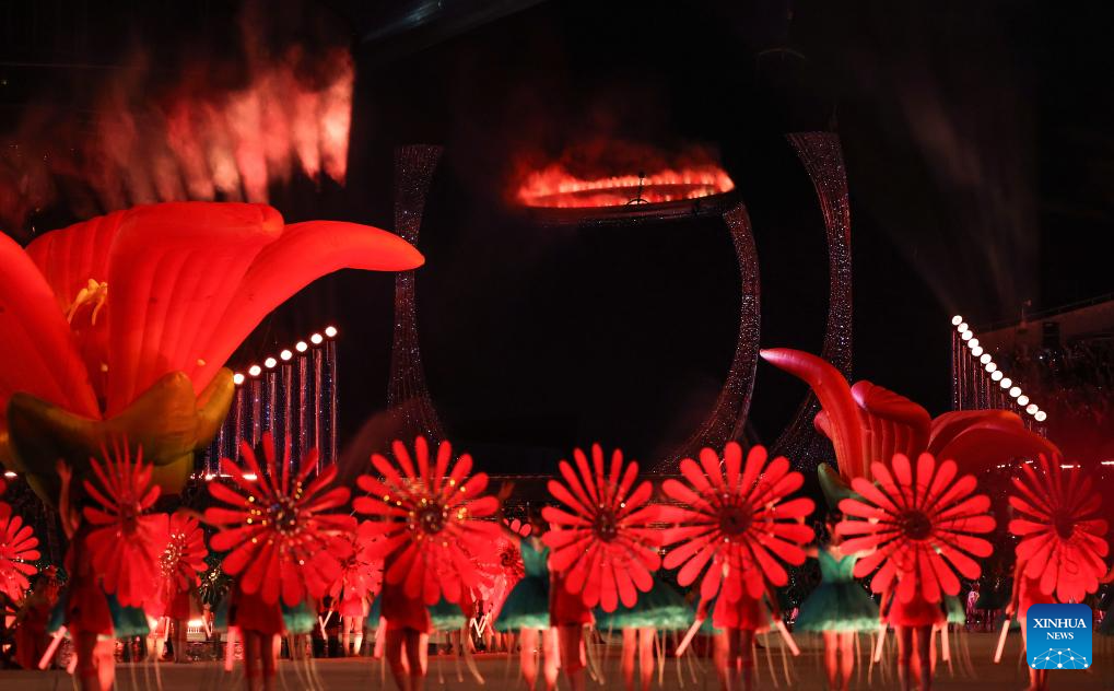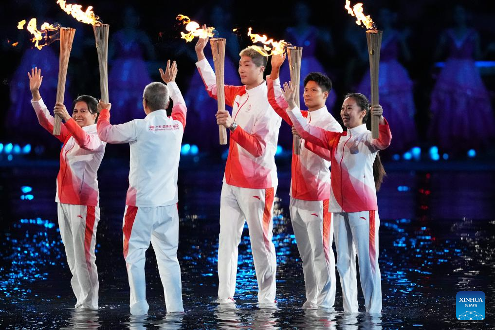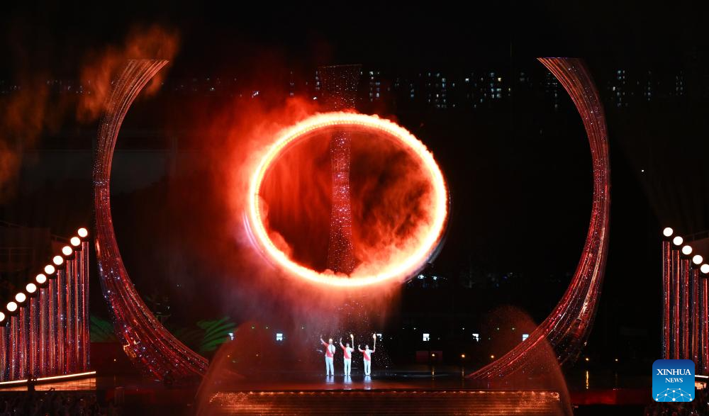 The cauldron is lit during the opening ceremony of China's 15th National Games in Guangzhou, south China's Guangdong Province, Nov. 9, 2025. (Xinhua/Hu Huhu)