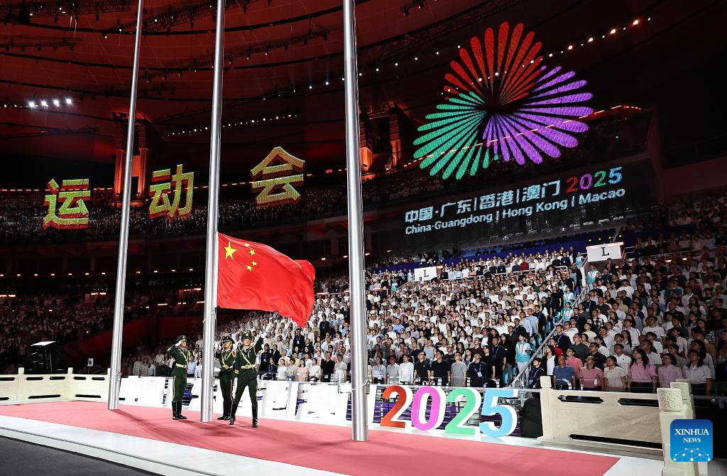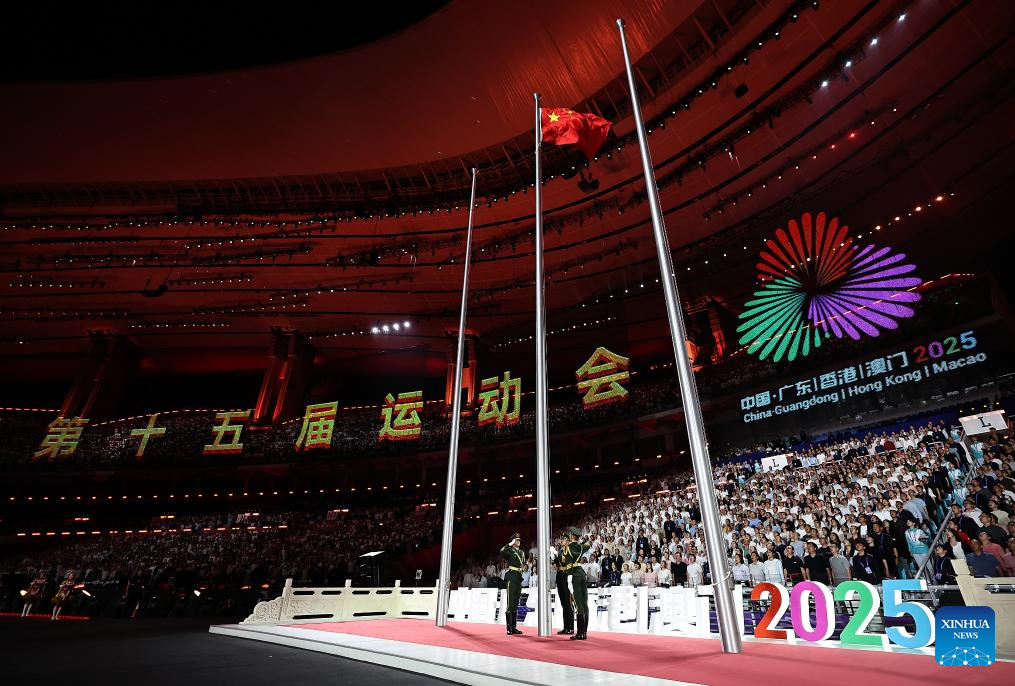 The Chinese national flag is raised during the opening ceremony of China's 15th National Games in Guangzhou, south China's Guangdong Province, Nov. 9, 2025. (Xinhua/Huang Wei)