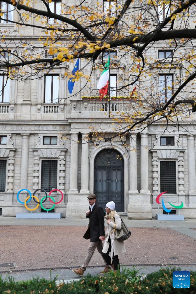 People walk past the emblems of Olympic and Paralympic Games in front of the City Hall of Milan in Milan, Italy, Oct. 29, 2025. The Milan-Cortina 2026 Olympic Winter Games will open on February 6, 2026 at Milan's San Siro Stadium. (Xinhua/Li Jing)