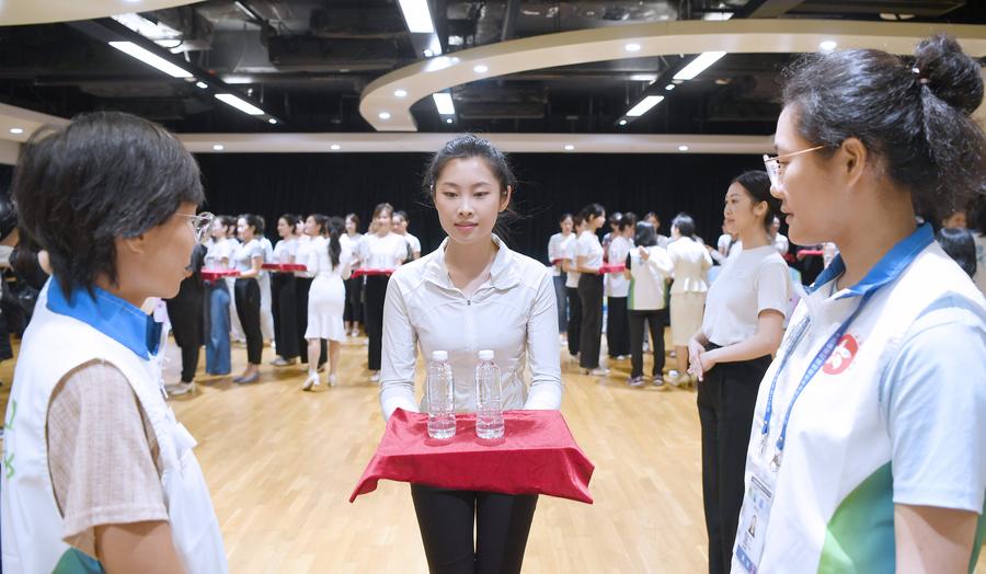 HONG KONG, Nov. 9 (Xinhua) -- In mid-October, as Hong Kong's summer heat lingered, the Scout Centennial Building buzzed with focused energy. Among the trainees was 22-year-old Wang Gongyu, a junior accounting student at the Hang Seng University of Hong Kong, practicing ceremonial tray-bearing with military precision.