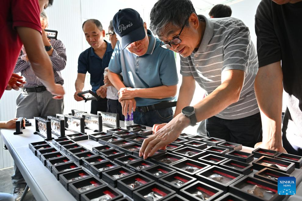 Archaeologists observe samples unearthed from the Luobi Cave relic site in Sanya, south China's Hainan Province, Nov. 8, 2025. A prehistoric tomb dating back between 12,000 and 13,000 years was discovered in south China's Hainan Province, which is believed to be the earliest tomb found on the island.