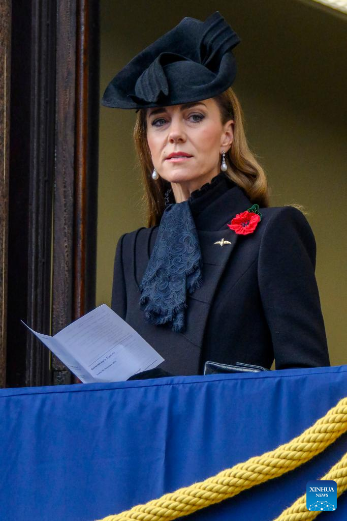 Britain's Catherine, Princess of Wales, attends the Remembrance Sunday ceremony in London, Britain, on Nov. 9, 2025. The Remembrance Sunday ceremony is an annual event to pay tribute to the war dead of Britain and the Commonwealth, which is held on the nearest Sunday to the anniversary of the end of World War I on Nov. 11, 1918. (Photo by Ray Tang/Xinhua)