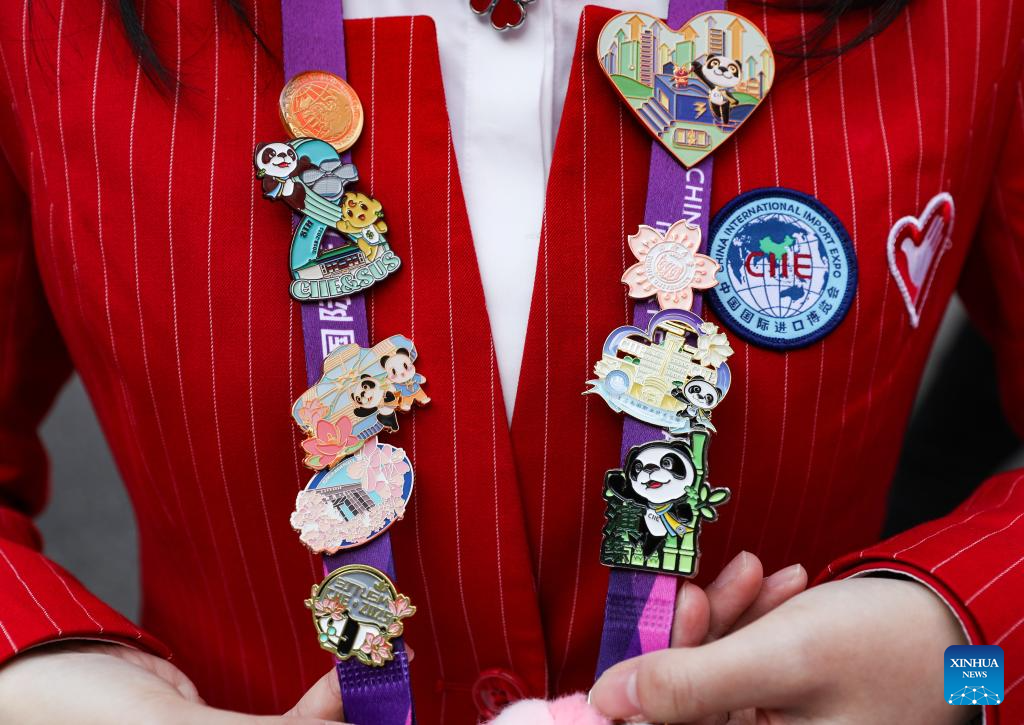 A volunteer shows collected badges at the eighth China International Import Expo (CIIE) in east China's Shanghai, Nov. 10, 2025. The 8th CIIE concluded here on Monday. (Xinhua/Wang Jingqiang)