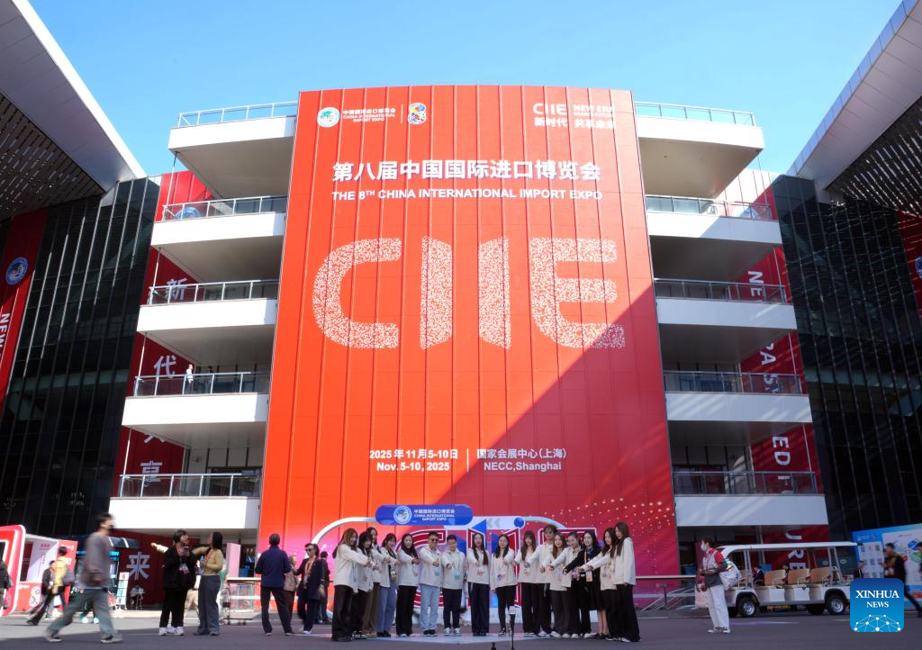 People pose for a group photo at the National Exhibition and Convention Center (Shanghai), the main venue of the eighth China International Import Expo (CIIE) in east China's Shanghai, Nov. 10, 2025. The 8th CIIE concluded here on Monday. (Xinhua/Liu Ying)