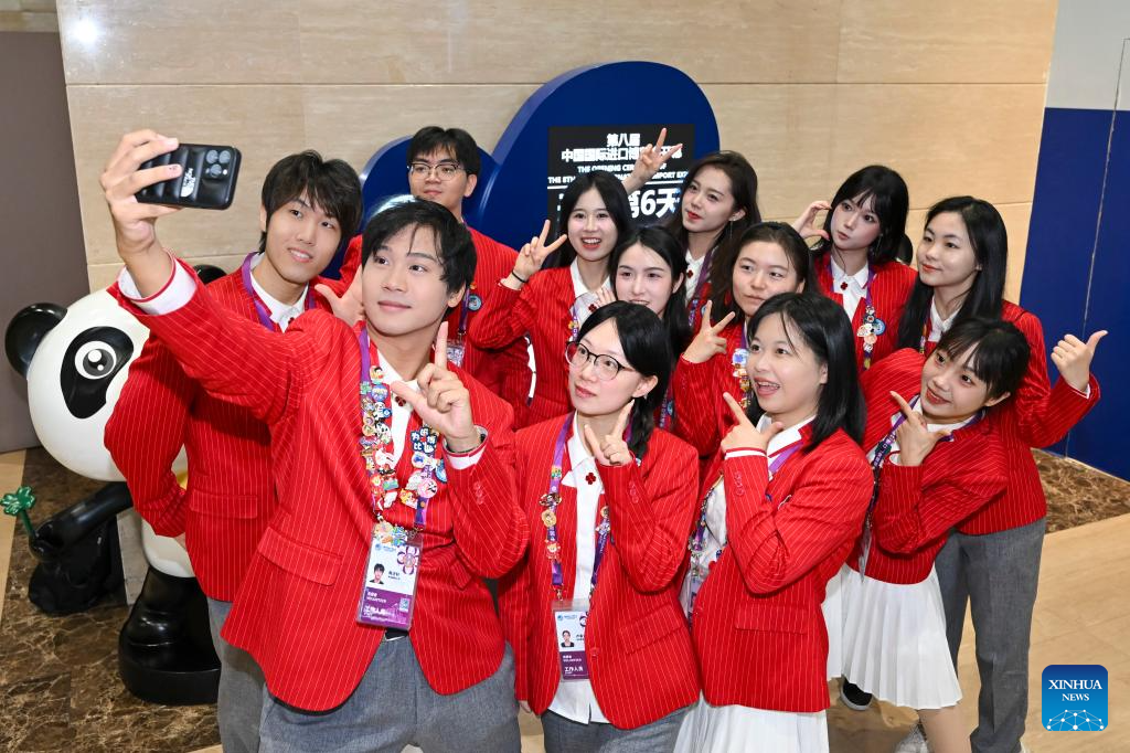 Volunteers pose for selfies at the National Exhibition and Convention Center (Shanghai), the main venue of the eighth China International Import Expo (CIIE) in east China's Shanghai, Nov. 10, 2025. The 8th CIIE concluded here on Monday. (Xinhua/Wang Jingqiang)