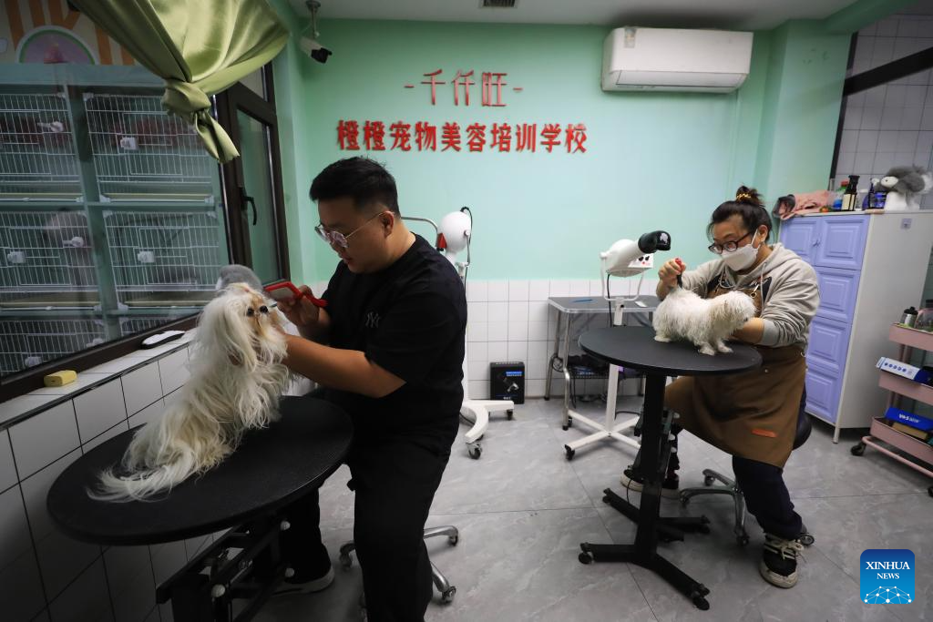 Staff members groom pet dogs at a pet grooming training school in Tiexi District of Anshan, northeast China's Liaoning Province, Nov. 7, 2025. In recent years, Anshan, a traditional industrial city, has gained new vitality with the development of a distinctive pet industry cluster that spans pet carrier manufacturing, food processing, and grooming services. (Xinhua/Yang Qing)