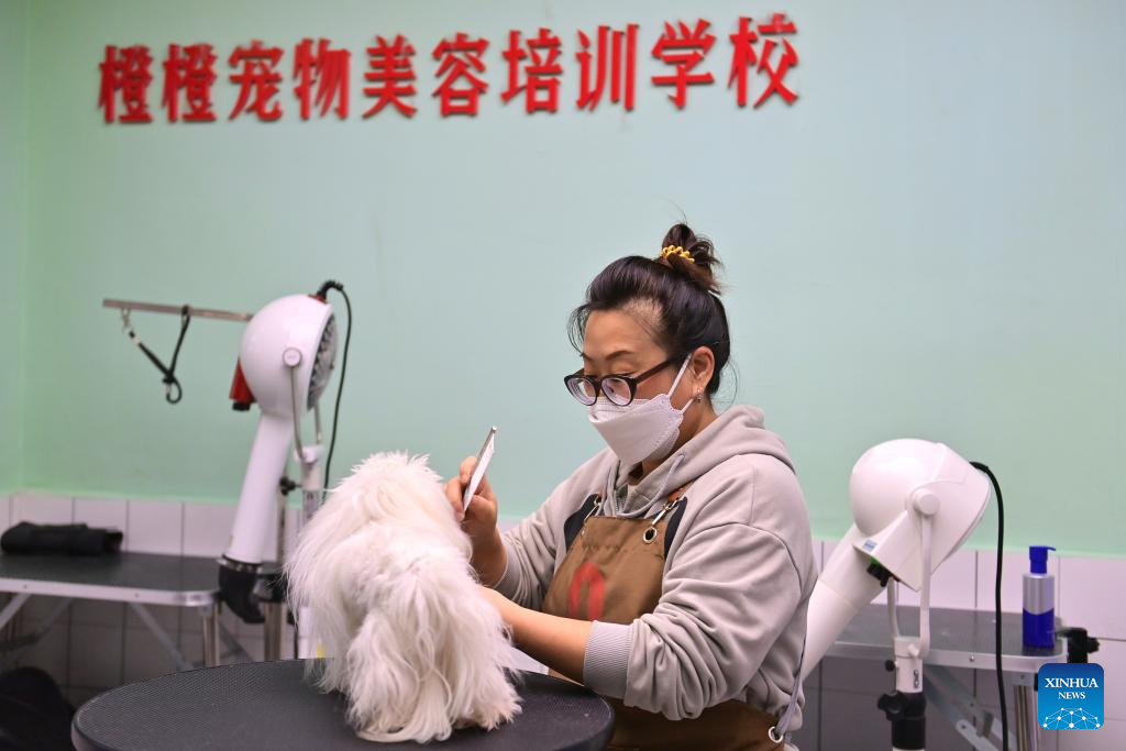 A staff member grooms a pet dog at a pet grooming training school in Tiexi District of Anshan, northeast China's Liaoning Province, Nov. 7, 2025. In recent years, Anshan, a traditional industrial city, has gained new vitality with the development of a distinctive pet industry cluster that spans pet carrier manufacturing, food processing, and grooming services. (Xinhua/Wu Qinghao)