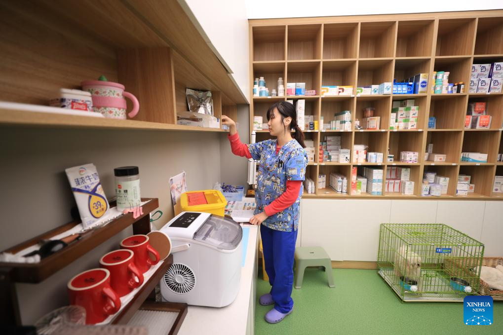A staff member arranges medicine at a pet hospital in Tiexi District of Anshan, northeast China's Liaoning Province, Nov. 7, 2025. In recent years, Anshan, a traditional industrial city, has gained new vitality with the development of a distinctive pet industry cluster that spans pet carrier manufacturing, food processing, and grooming services. (Xinhua/Yang Qing)