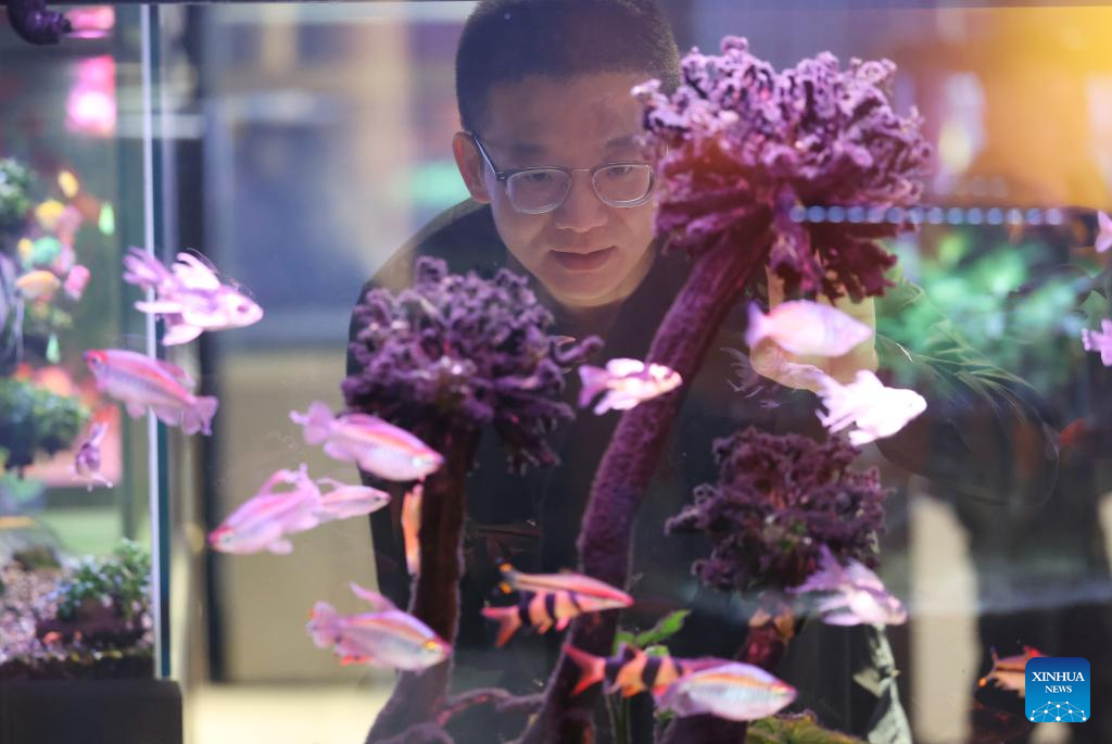 A customer buys ornamental fish at a market in Anshan, northeast China's Liaoning Province, April 10, 2025. In recent years, Anshan, a traditional industrial city, has gained new vitality with the development of a distinctive pet industry cluster that spans pet carrier manufacturing, food processing, and grooming services. (Xinhua/Wu Qinghao)