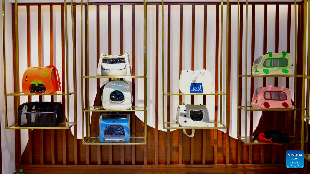 Pet carrier products are pictured in Nantai Township of Haicheng City in Anshan, northeast China's Liaoning Province, Oct. 21, 2025. In recent years, Anshan, a traditional industrial city, has gained new vitality with the development of a distinctive pet industry cluster that spans pet carrier manufacturing, food processing, and grooming services. (Xinhua/Wu Qinghao)