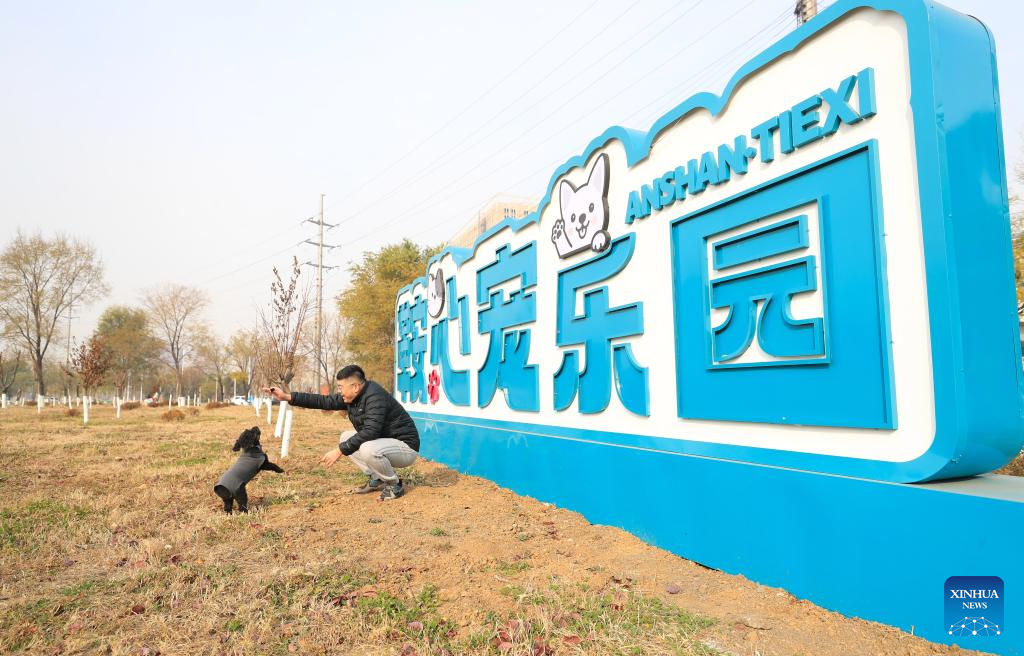 A pet dog plays at a park in Tiexi District of Anshan, northeast China's Liaoning Province, Nov. 7, 2025. In recent years, Anshan, a traditional industrial city, has gained new vitality with the development of a distinctive pet industry cluster that spans pet carrier manufacturing, food processing, and grooming services. (Xinhua/Yang Qing)
