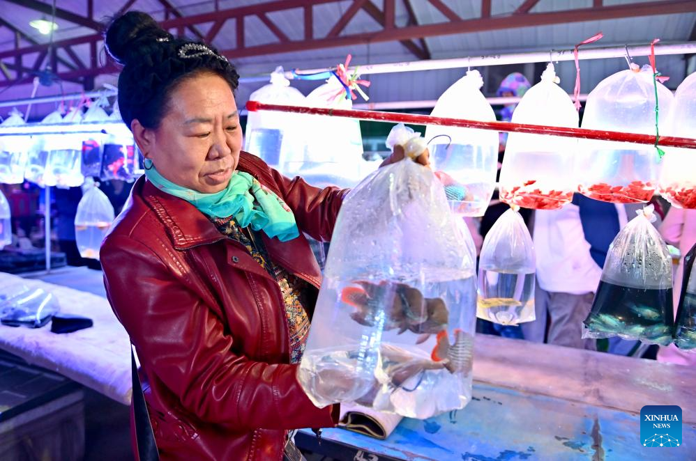 A shop owner displays ornamental fish at a market in Anshan, northeast China's Liaoning Province, April 10, 2025. In recent years, Anshan, a traditional industrial city, has gained new vitality with the development of a distinctive pet industry cluster that spans pet carrier manufacturing, food processing, and grooming services. (Xinhua/Wu Qinghao)