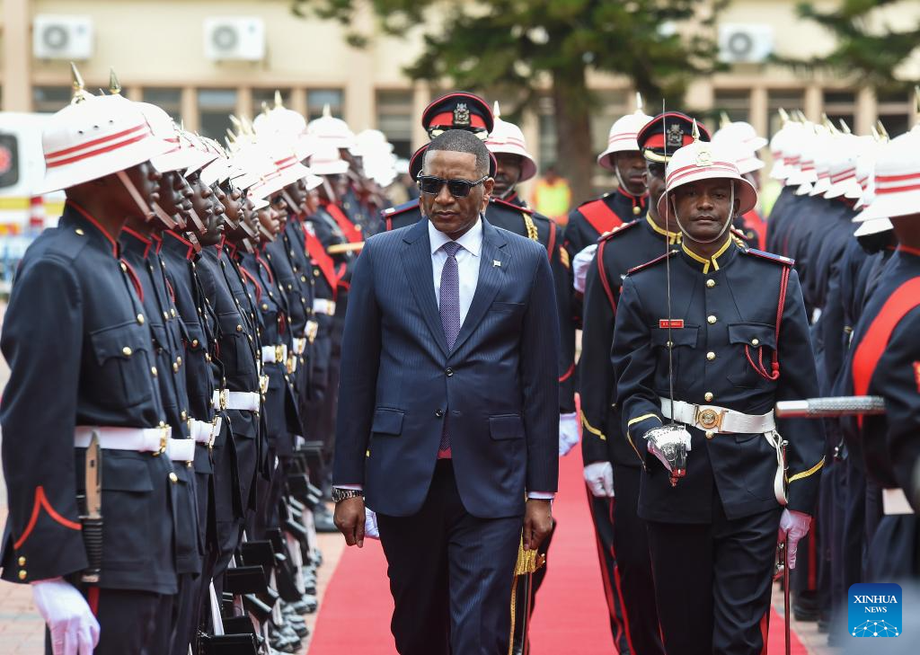 Botswana's President Duma Boko (C) inspects the guard of honor before delivering this year's State of the Nation Address in Gaborone, Botswana, on Nov. 10, 2025. (Photo by Tshekiso Tebalo/Xinhua)
