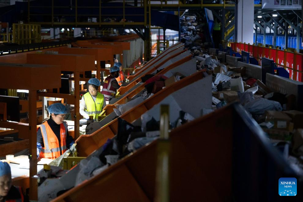 Staff members sort parcels at a branch of China Post in Harbin, northeast China's Heilongjiang Province, Nov. 10, 2025. With the "Double Eleven" online shopping festival approaching, a branch of China Post in Harbin has taken measures to ensure package delivery. (Xinhua/Zhang Tao)