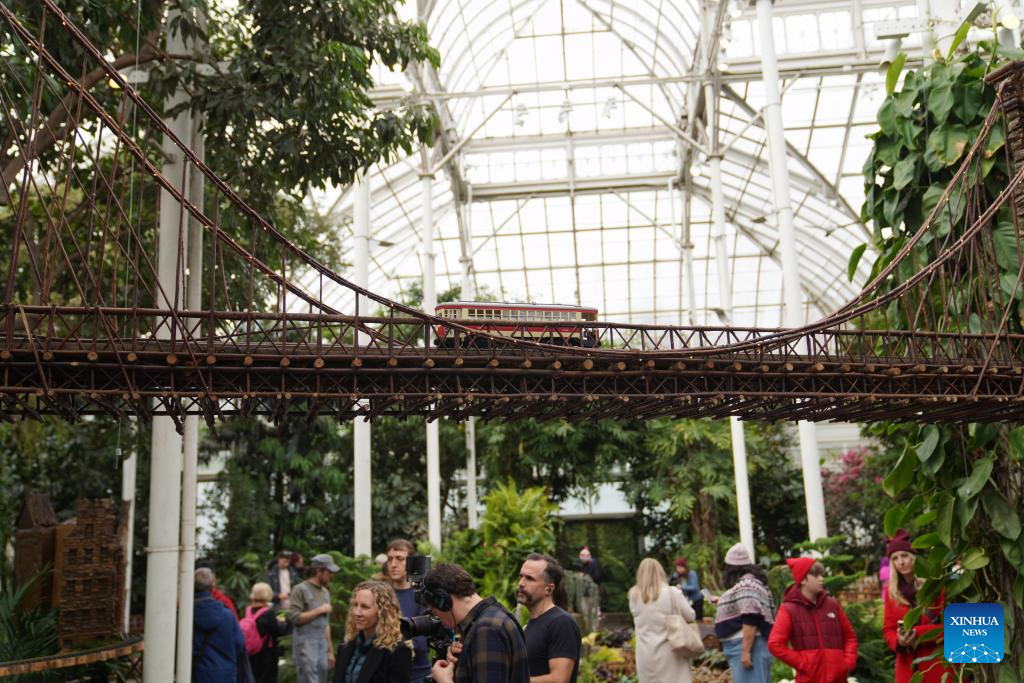 Visitors watch a model train during a preview of the Holiday Train Show at New York Botanical Garden in New York, the United States, on Nov. 11, 2025. A preview for the Holiday Train Show, which is open to the public from Nov. 15, 2025 to Jan. 11, 2026, was held at the New York Botanical Garden on Tuesday, showcasing large-scale model trains running in a miniature New York City where nearly 200 scaled iconic buildings and structures are recreated using bark, leaves and other natural materials. (Xinhua/Zhang Fengguo)