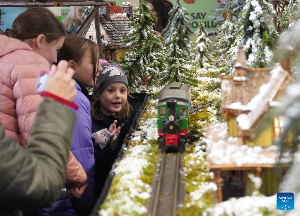 Children watch a model train during a preview of the Holiday Train Show at New York Botanical Garden in New York, the United States, on Nov. 11, 2025. A preview for the Holiday Train Show, which is open to the public from Nov. 15, 2025 to Jan. 11, 2026, was held at the New York Botanical Garden on Tuesday, showcasing large-scale model trains running in a miniature New York City where nearly 200 scaled iconic buildings and structures are recreated using bark, leaves and other natural materials. (Xinhua/Zhang Fengguo)