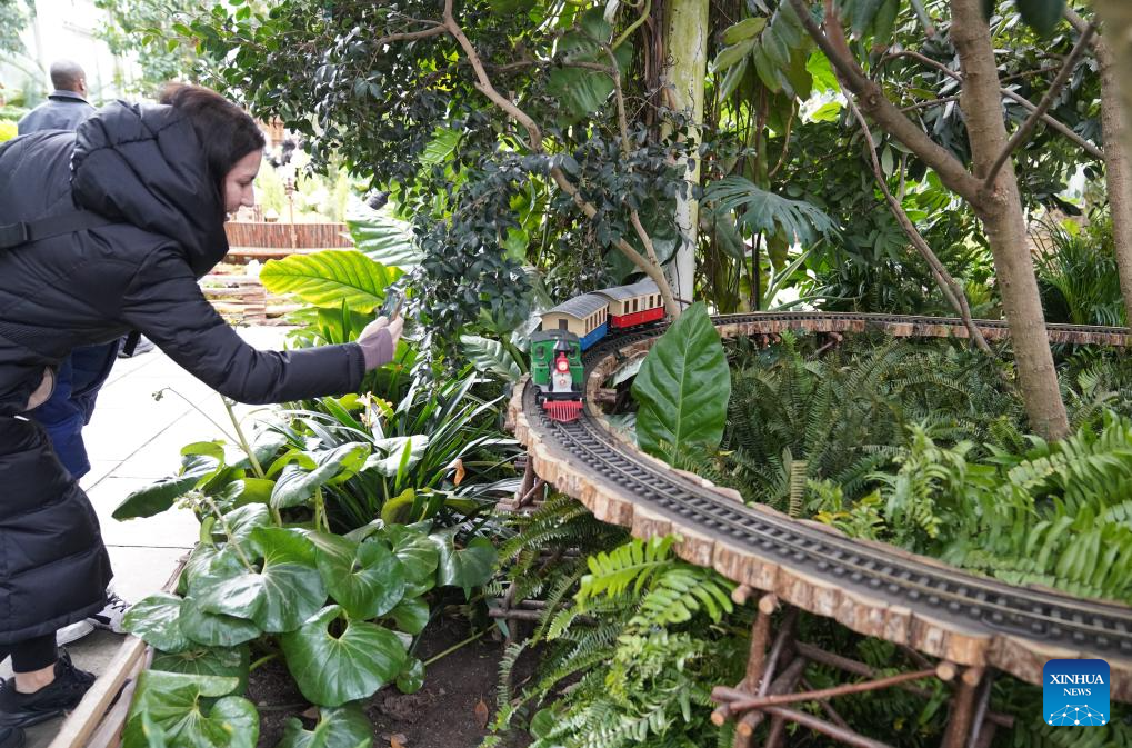 Visitors take photos of model trains during a preview of the Holiday Train Show at New York Botanical Garden in New York, the United States, on Nov. 11, 2025. A preview for the Holiday Train Show, which is open to the public from Nov. 15, 2025 to Jan. 11, 2026, was held at the New York Botanical Garden on Tuesday, showcasing large-scale model trains running in a miniature New York City where nearly 200 scaled iconic buildings and structures are recreated using bark, leaves and other natural materials. (Xinhua/Zhang Fengguo)