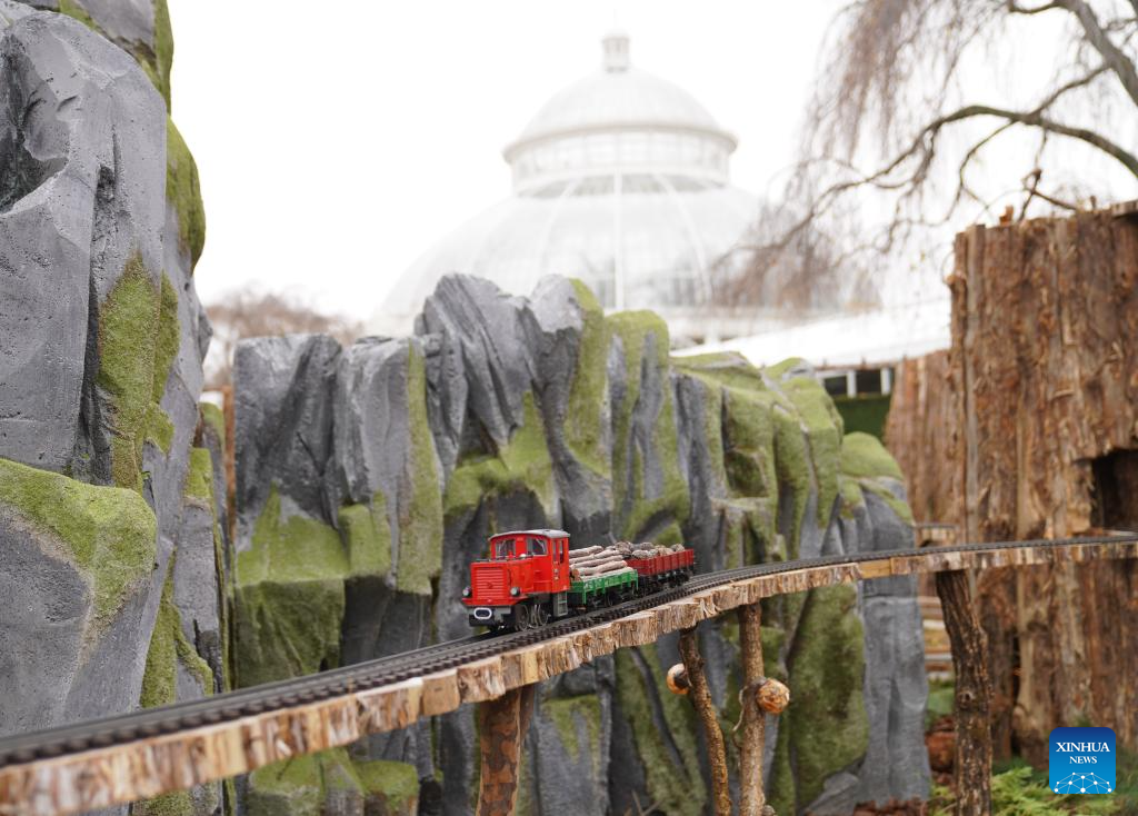 A model train is seen during a preview of the Holiday Train Show at New York Botanical Garden in New York, the United States, on Nov. 11, 2025. A preview for the Holiday Train Show, which is open to the public from Nov. 15, 2025 to Jan. 11, 2026, was held at the New York Botanical Garden on Tuesday, showcasing large-scale model trains running in a miniature New York City where nearly 200 scaled iconic buildings and structures are recreated using bark, leaves and other natural materials. (Xinhua/Zhang Fengguo)