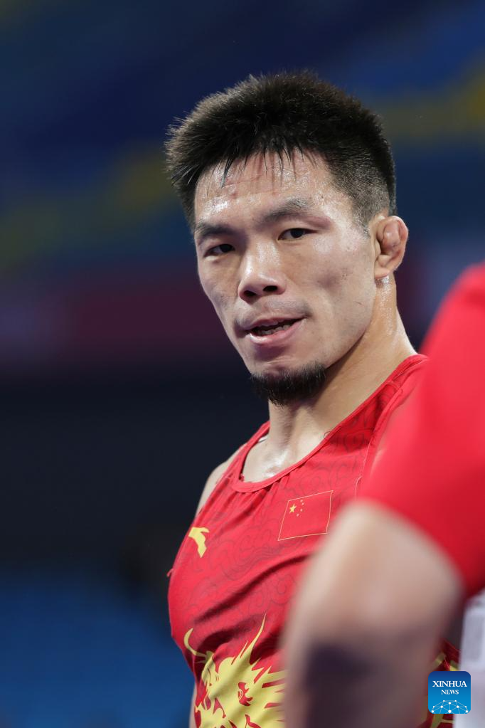 Yuan Shaohua of Zhejiang reacts while competing against Ou Xuexian of Guangdong in the men's freestyle 65kg final match of wrestling at China's 15th National Games in Qingyuan, south China's Guangdong Province, Nov. 11, 2025. (Xinhua/Li Ran)