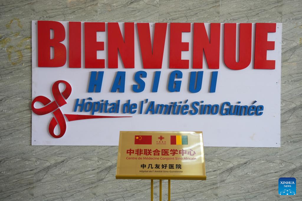 This photo taken on Nov. 12, 2025 shows a signboard of the China-Africa Joint Medical Center in Conakry, Guinea.