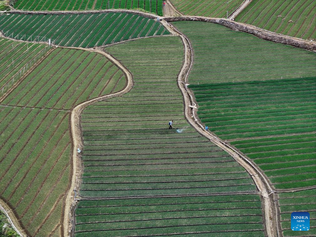 An aerial drone photo taken on Nov. 11, 2025 shows villagers taking care of chives in Jueshan Village of Sandu Town in Liuzhou City, south China's Guangxi Zhuang Autonomous Region. Sandu Town has in recent years promoted the standardized and industrialized production of chives, and developed an integrated business system that ranges from planting and processing to sales and service.