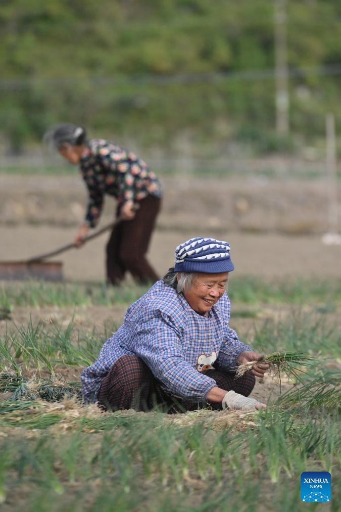 To date, the planting area of chives in Sandu Town has topped 43,000 mu (about 2,867 hectares, multiple cropping included), with an annual output of approximately 100,000 metric tons. (Xinhua/Huang Xiaobang)