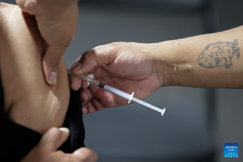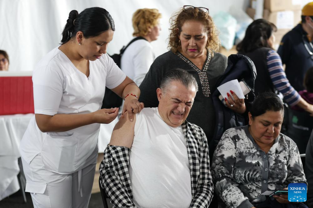 A health worker administers a vaccine to a citizen at a vaccination center in Mexico City, capital of Mexico, Nov. 12, 2025. Mexico City has set up a vaccination center offering influenza, COVID-19, pneumococcal and measles vaccines to the public as part of efforts to improve community immunization coverage during the winter season. (Photo by Francisco Canedo/Xinhua)