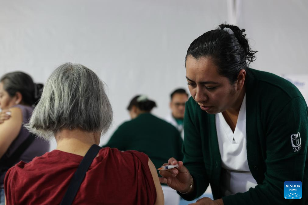 A health worker administers a vaccine to a woman at a vaccination center in Mexico City, capital of Mexico, Nov. 12, 2025. Mexico City has set up a vaccination center offering influenza, COVID-19, pneumococcal and measles vaccines to the public as part of efforts to improve community immunization coverage during the winter season. (Photo by Francisco Canedo/Xinhua)