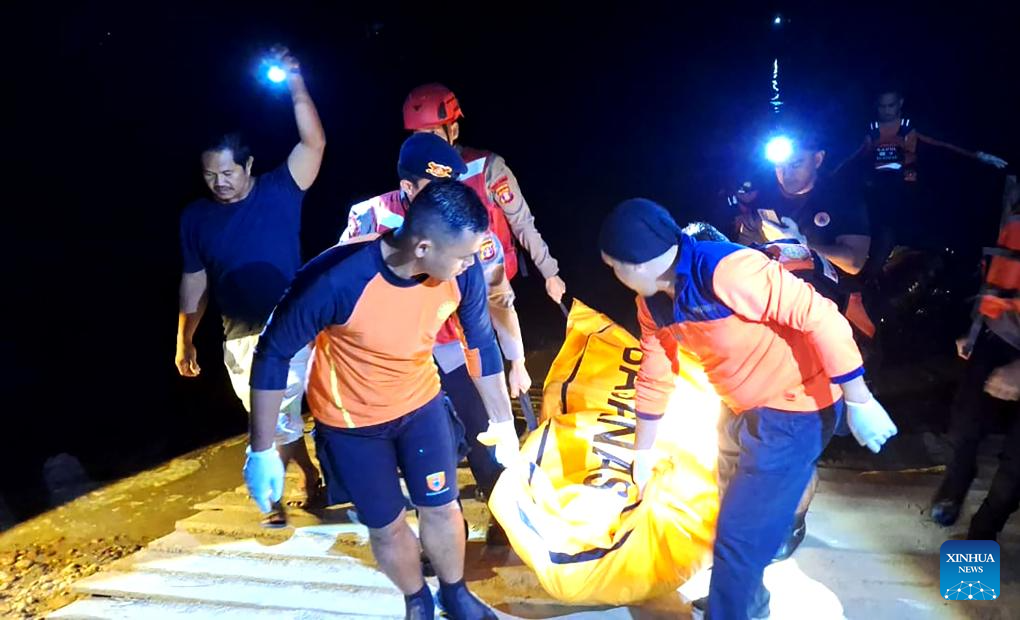 This photo provided by Indonesia's National Search And Rescue Agency (Basarnas) shows rescuers transferring a body pack after a ship sank in the Mahakam River in West Kutai regency, East Kalimantan province, Indonesia, on Nov. 12, 2025. Eight people were found dead after a ship sank in the Mahakam River in Indonesia's East Kalimantan province, head of the province's Search and Rescue Office Dody Setiawan said on Thursday. (Basarnas/Handout via Xinhua)