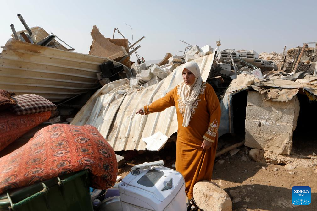A Palestinian woman is pictured among debris after an Israeli bulldozer demolished Palestinian houses and tents in Masafer Yatta, southern West Bank city of Hebron, Nov. 12, 2025. (Photo by Mamoun Wazwaz/Xinhua)